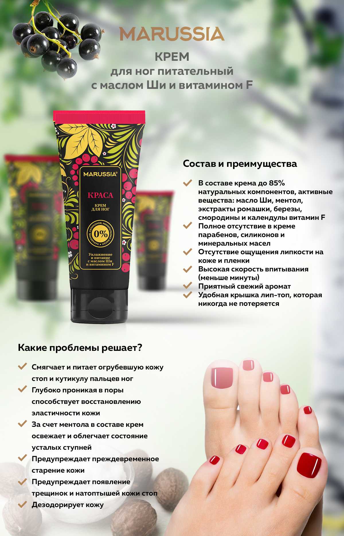 Быстро впитывающийся, легкий сливочный крем с активной формулой для интенсивного ухода за кожей стоп. Устраняет сухость кожи, питает и смягчает кожу, предупреждая появление мозолей и трещин. Экстракт черной смородины тонизирует, устраняет чувство тяжести и усталости, экстракты березы и ромашки быстро заживляют ранки и потертости. Ментол в составе, приятно охлаждает кожу ног, масло ши и витамин F глубоко питают и восстанавливают кожу ног. Легко наносится и быстро впитывается без ощущения липкости. Имеет легкий охлаждающий и дезодорирующий эффект.