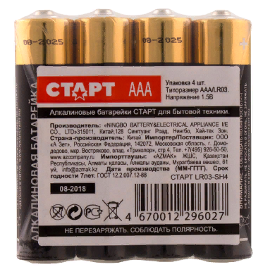 Комплект щелочных элементов питания от компании СТАРТ включает в себя 4 батарейки.